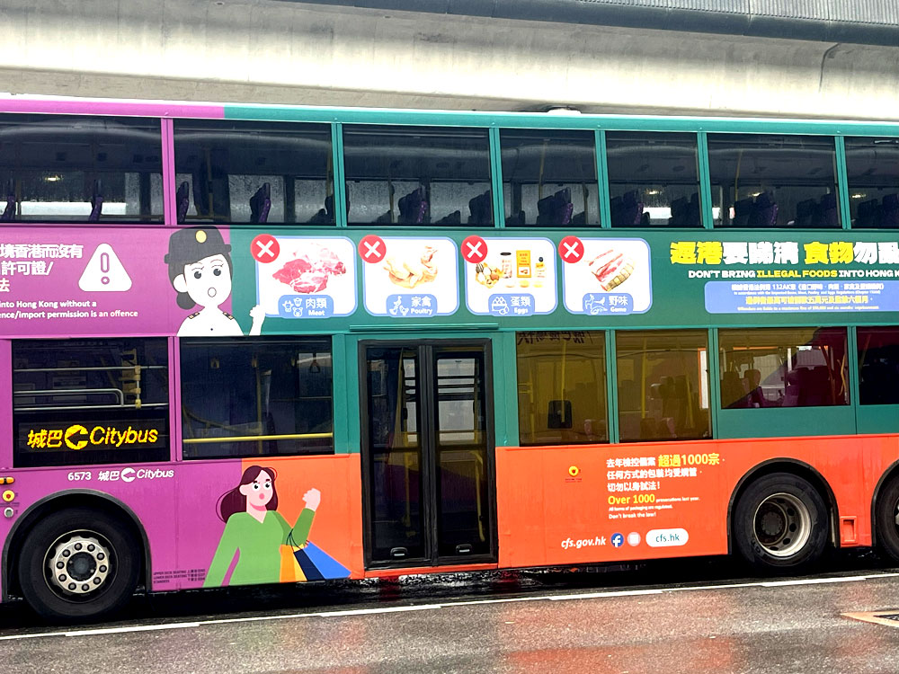 ちなみに香港のバスは赤やオレンジや黄色のカラフルな二階建て。