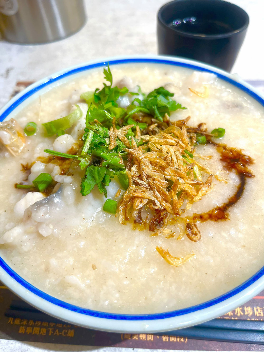 立ち寄ったお粥屋さんで海鮮粥を頼みました。かき混ぜると、海の中からいろいろな魚がでてくる。